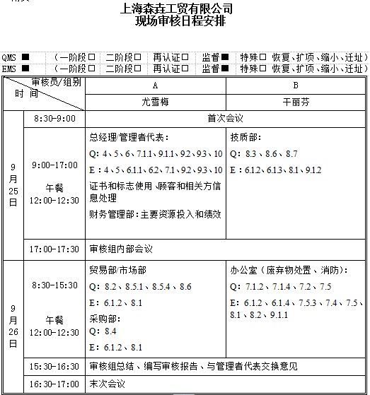 本月的25號和26號我們將迎來質量管理體系和環(huán)境管理換版后的第一次外部審核。具體審核的安排如下:
