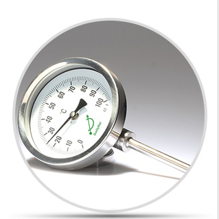 雙金屬溫度計(jì)的工作原理是使用一塊帶溫度傳感裝置的熱雙金屬纏繞在螺紋上,將其安裝在保護(hù)套中稱為自由端。自由端線軸上有一個指針。當(dāng)溫度變化時,溫度傳感裝置的自由端隨之旋轉(zhuǎn),從而驅(qū)動細(xì)軸上的指針改變角度,并在表盤上指示相應(yīng)的溫度。