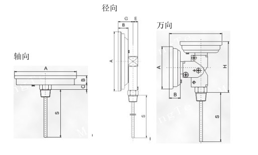雙金屬溫度計(jì)是將繞成螺紋旋形的熱雙金屬片作為感溫器件,并把它裝在保護(hù)套管內(nèi),其中一端固定,稱為固定端,另一端連接在一根細(xì)軸上,稱為自由端。在自由端線軸上裝有指針。當(dāng)溫度發(fā)生變化時,感溫器件的自由端隨之發(fā)生轉(zhuǎn)動,帶動細(xì)軸上的指針產(chǎn)生角度變化,在標(biāo)度盤上指示對應(yīng)的溫度。今天給大家分享一下徑向,萬向,軸向雙金屬溫度計(jì)的結(jié)構(gòu)圖。